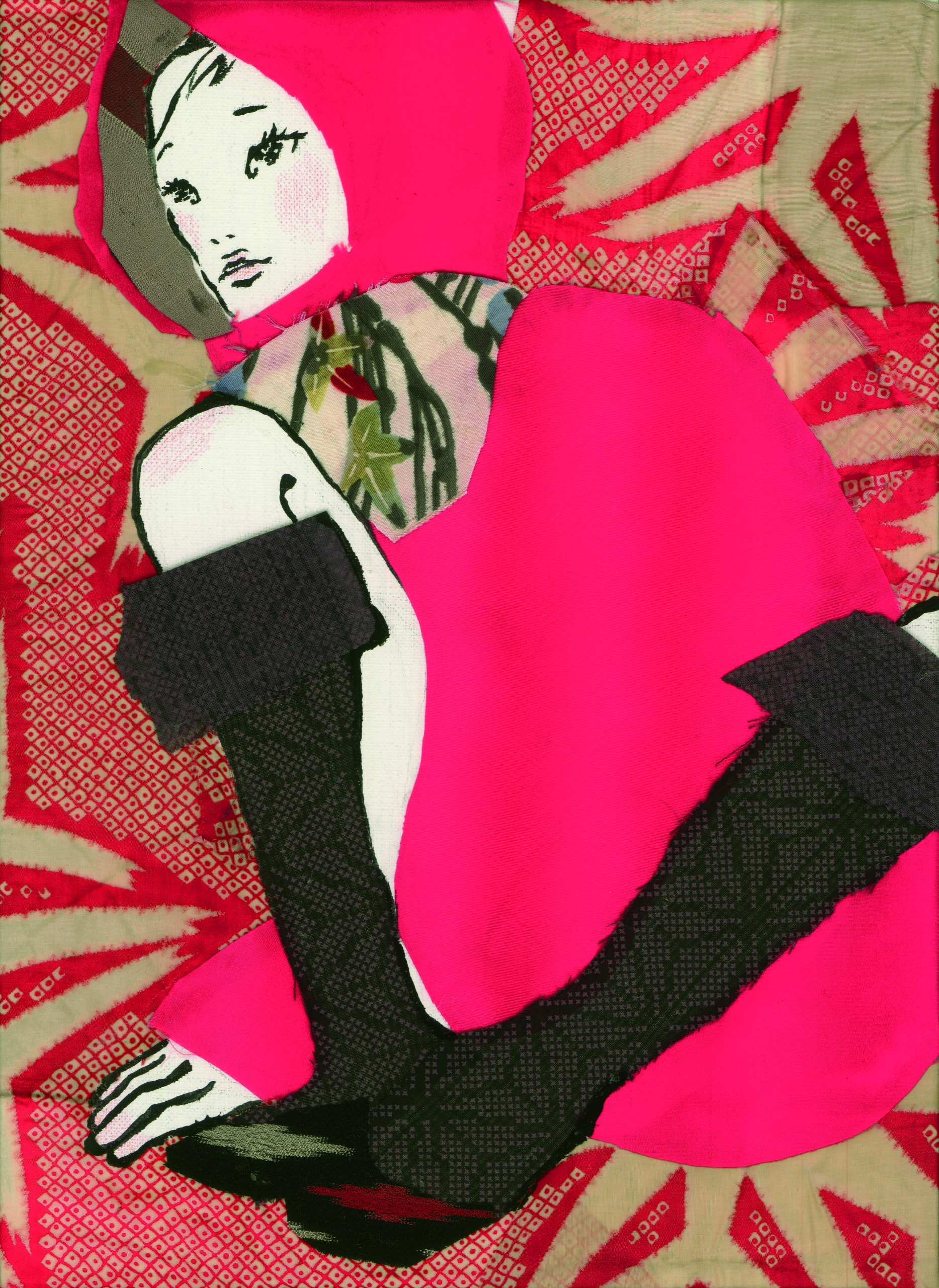フライヤーに使用している絵は、〈happalucca〉の「赤ずきんちゃん」ラインのために制作されたもので、作家が祖母から譲り受けた着物の端切れをコラージュした作品です。